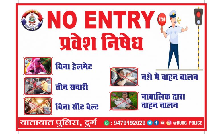 वहीं वाहन चालकों को पंपलेट बांटकर यातायात नियमों का पालन करने हेतु समझाइश दी गई है। इसमें कहा गया है कि इन सभी 11 स्थानों से दुर्ग जिले में प्रवेश करने वालों की सख्त चेकिंग की जाएगी। और सभी चौराहों पर थाने का संयुक्त बल मौजूद रहेगा। खासकर शाम 6:00 बजे से 8:00 बजे तक। इस दौरान ऐसे किसी भी वाहन चालक को दुर्ग जिले में प्रवेश नहीं करने दिया जाएगा जो यातायात नियमों का उल्लंघन करता हो। पुलिस के मुताबिक बिना हेलमेट बिना सीट बेल्ट दो पहिया वाहन में तीन सवारी नाबालिक द्वारा वाहन चालन और नशे में वाहन चालन पर सख्ती करने के लिए पुलिस ने यह निर्णय लिया है।