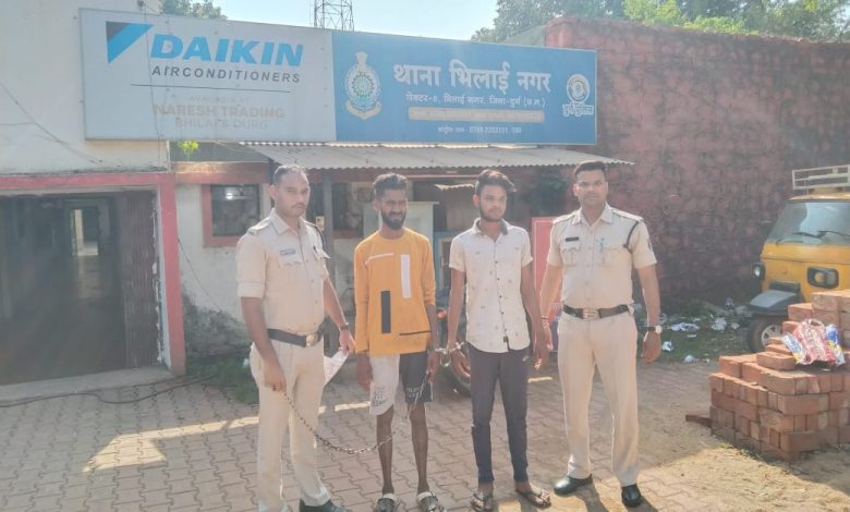 थाना भिलाई नगर क्षेत्र मे अवैध लाभ अर्जित करने के लिए मादक पदार्थ गांजा का परिवहन करने वाले आरोपी को भिलाई नगर पुलिस ने किया गिरफ्तार आरोपी 1 साहिल राय पिता विजय राय उम्र 19 साल साकिन ग्राम मतवारी थाना अण्डा जिला दुर्ग 2. रुचित साहू पिता संतोष साहू उम्र 25 साल वार्ड क्र. 17 शांति नगर थाना मोहन नगर जिला दुर्ग को किया गया गिरफ्तार आरोपीगणो के कब्जे से कुल 3.950 किलोग्राम गांजा एवं एक होंडा साईन मोटर सायकल क्र. CG 07 LT 5738 जब्त , जब्तशुदा गांजा की कीमत करीबन 40000 रुपए
