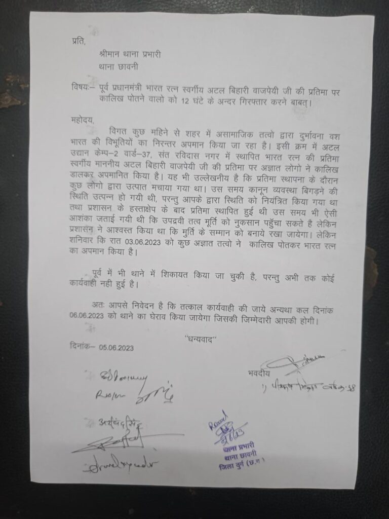 विगत कुछ महिने से शहर में असामाजिक तत्वों द्वारा दुर्भावना वश भारत की विभूतियों का निरन्तर अपमान किया जा रहा है। इसी क्रम में अटल उद्यान केम्प – 2 वार्ड-37, संत रविदास नगर में स्थापित भारत रत्न की प्रतिमा स्वर्गीय माननीय अटल बिहारी वाजपेयी जी की प्रतिमा पर अज्ञात लोगो ने कालिख डालकर अपमानित किया है। यह भी उल्लेखनीय है कि प्रतिमा स्थापना के दौरान कुछ लोगो द्वारा उत्पात मचाया गया था। उस समय कानून व्यवस्था बिगड़ने की स्थिति उत्पन्न हो गयी थी, परन्तु आपके द्वारा स्थिति को नियंत्रित किया गया था तथा प्रशासन के हस्ताक्षेप के बाद प्रतिमा स्थापित हुई थी उस समय भी ऐसी आशंका जताई गयी थी कि उपद्रवी तत्व मूर्ति को नुकसान पहुँचा सकते है लेकिन प्रशासन ने आश्वस्त किया था कि मूर्ति के सम्मान को बनाये रखा जायेगा। लेकिन शनिवार कि रात 03.06.2023 को कुछ अज्ञात तत्वो ने कालिख पोतकर भारत रत्न का अपमान किया है। पूर्व में भी थाने में शिकायत किया जा चुकी है. परन्तु अभी तक कोई कार्यवाही नही हुई है।अतः आपसे निवेदन है कि तत्काल कार्यवाही की जाये अन्यथा कल दिनांक 06.06.2023 को थाने का घेराव किया जायेगा जिसकी जिम्मेदारी आपकी होगी।
