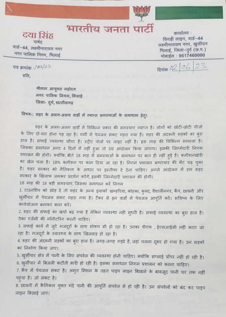 18 सूत्री मांगों को लेकर भिलाई निगम का आज घेराव करेगी बीजेपी, इधर छावनी थाने का भी घेराव करेगी बीजेपी आरोपी की गिरफ्तारी को लेकर जानिए क्या है पूरा मामला