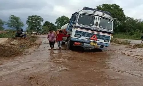 सोंढूर नदी में आई बाढ़ से ग्रामीणों से भरा ट्रक फंसा