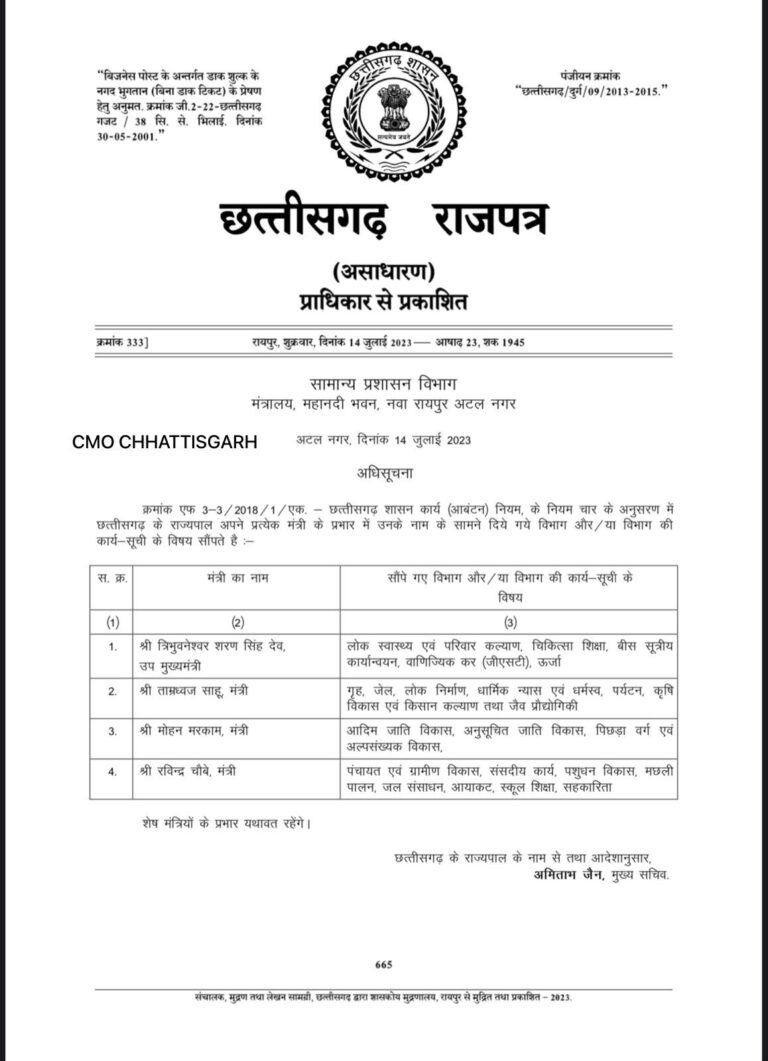 भूपेश कैबिनेट के चार मंत्रियों के विभागों में फेरबदल…राजपत्र में अधिसूचना प्रकाशित