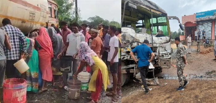 CG : तेज रफ़्तार बस और टैंकर में भिड़ंत, डीजल के लिए लोगों में मची लूट