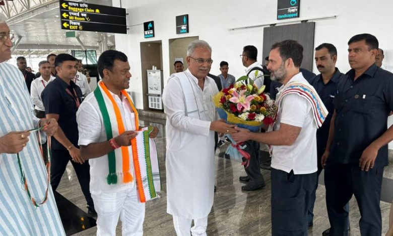 रायपुर। : राजीव युवा मितान सम्मेलन में शामिल होने राहुल गांधी रायपुर पहुंच चुके है। सांसद राहुल गांधी का मुख्यमंत्री भूपेश बघेल ने राजधानी रायपुर के स्वामी विवेकानंद विमानतल पर पहुंचने पर पुष्पगुच्छ से आत्मीय स्वागत किया। सांसद राहुल गांधी राजधानी रायपुर में आयोजित राजीव युवा मितान सम्मेलन में शामिल होने विवेकानंद विमानतल से मेला ग्राउण्ड, कार्यक्रम स्थल के लिए रवाना हो गए है।