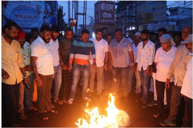 : भिलाई । तमिलनाडु सरकार के मंत्री उदयनिधि स्टालिन द्वारा सनातन धर्म पर की गई अपमानजनक टिप्पणी के विरोध में श्रीराम जन्मोत्सव समिति द्वारा श्रीराम चौक खुर्सीपार में पुतला दहन किया गया। समिति के युवा शाखा अध्यक्ष मनीष पाण्डेय के नेतृत्व में आक्रोशित सदस्यों ने उदयनिधि स्टालिन का पुतला दहन कर मुर्दाबाद के नारे लगाये। साथ ही खुर्सीपार क्षेत्र में मशााल रैली निकालकर अपना विरोध जताया गया।