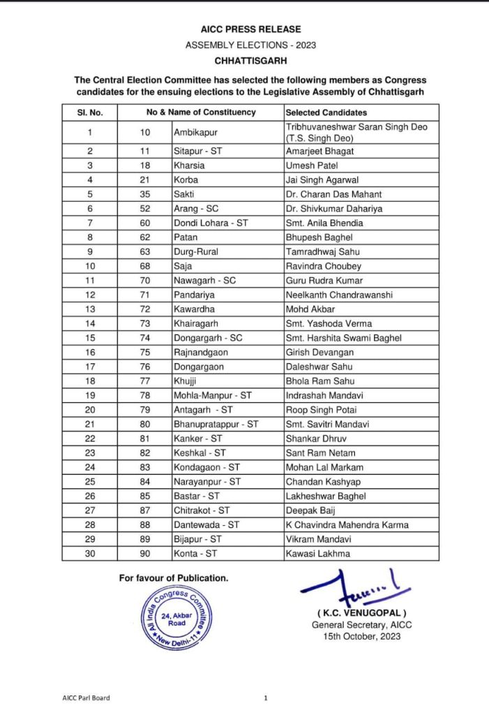 बिग ब्रेकिंग न्यूज़ कांग्रेस ने छत्तीसगढ़ के 30 प्रत्याशियों की सूची जारी की देखे सूची