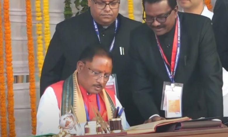 रायपुर। : मुख्यमंत्री विष्णुदेव साय ने ली छत्तीसगढ़ के मुख्यमंत्री की शपथ। राज्यपाल विश्वभूषण हरिचंदन ने दिलाई शपथ। पीएम मोदी सहित कई गणमान्य नेता मौजूद रहे। सीएम के बाद अरुण साव और विजय शर्मा ने डिप्टी सीएम पद की शपथ ली। राज्यपाल विश्वभूषण हरिचंदन ने दोनों उप मुख्यमंत्रियों को पद एवं गोपनीयता की दिलाई शपथ।