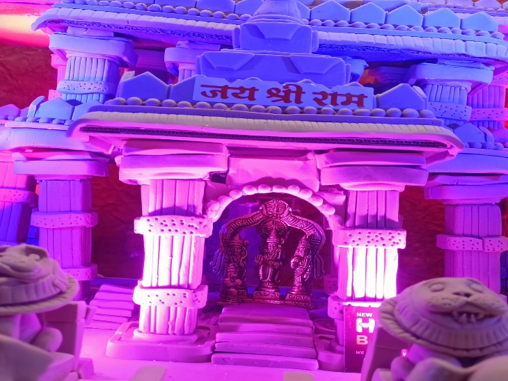 पहले पिलर को लगाया गया उसके बाद उपर का स्ट्रक्चर तैयार किया गया। अयोध्या में जिस तरह राम मंदिर की सीढ़ियां तैयार की गई है उसी तर्ज पर चॉकलेट से सीढ़ियों को बनाया गया है। इसके साथ मंदिर में कलश, शेर और हाथी , धनुष बाण भी तैयार किया गया है।