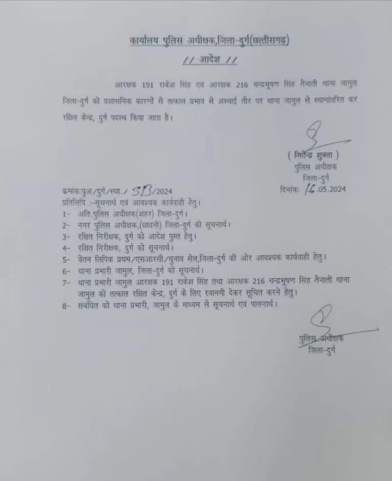 जामुल थाने में पदस्थ आरक्षक राकेश सिंह और आरक्षक चंद्र भूषण सिंह को भी एसपी शुक्ला ने पुलिस लाइन भेज दिया है। बताया जाता है कि आरक्षकों ने अपने सीनियर पुलिस कर्मी से दुर्व्यवहार किया था, जिसके चलते उन्हें लाइन भेजा गया। पिछले एक सप्ताह के अंदर दुर्ग जिले से लगभग आधा दर्जन से अधिक आरक्षक और प्रधान आरक्षक पर एसपी ने कार्रवाई की है।