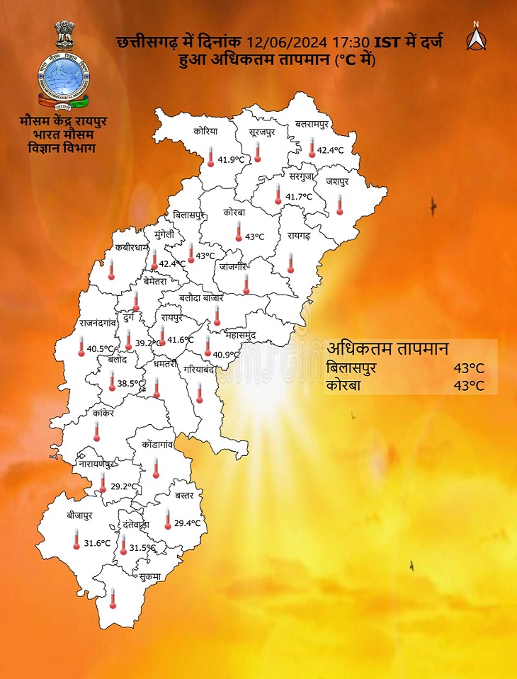- बुधवार को प्रदेश में अधिकतम तापमान 43 डिग्री कोरबा