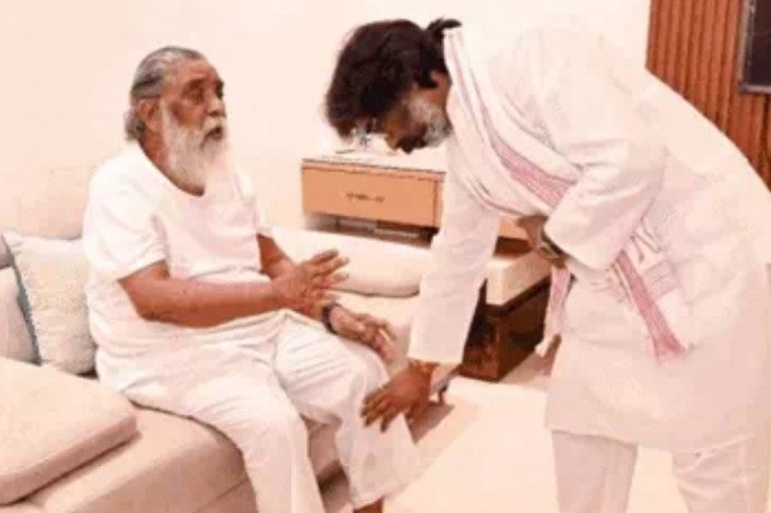 शपथ ग्रहण से पहले हेमंत सोरेन ने पिता शिबू सोरेन से मुलाकात की और पैर छूकर उनका आशीर्वाद लिया। X पर तस्वीरें शेयर कर हेमंत सोरेन ने लिखा-आदरणीय बाबा से मिलकर आगामी चुनौतियों से निपटने के लिए आशीर्वाद लिया।