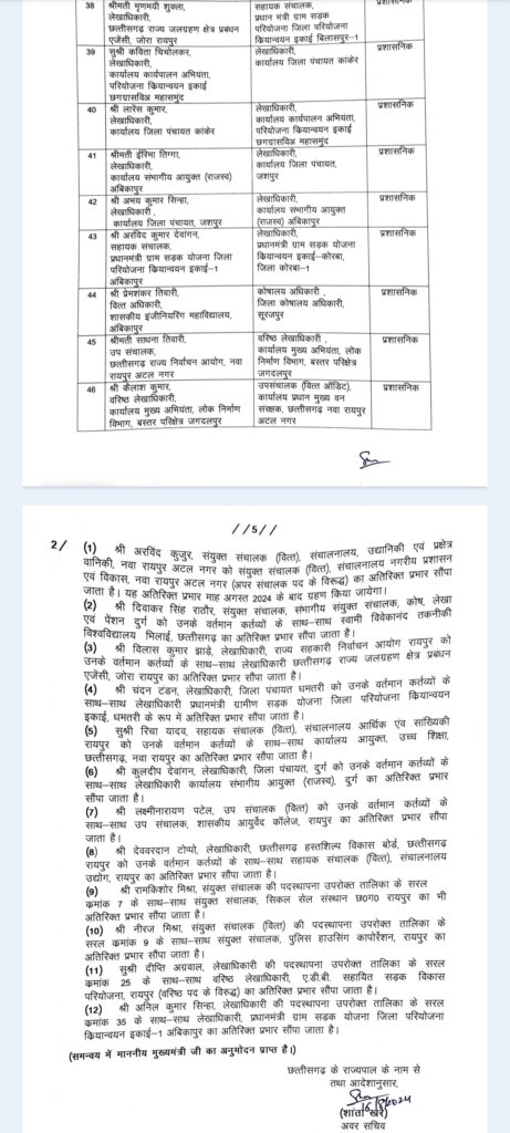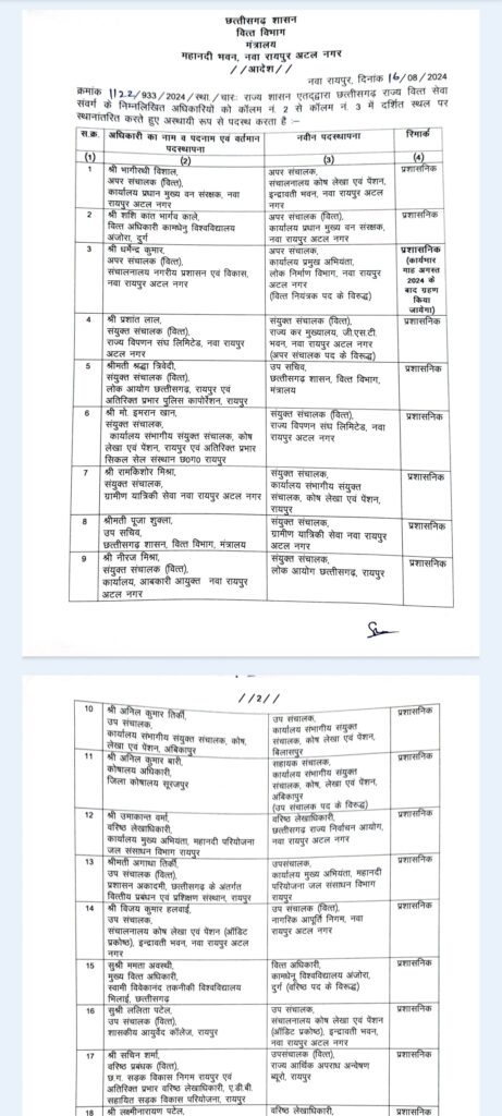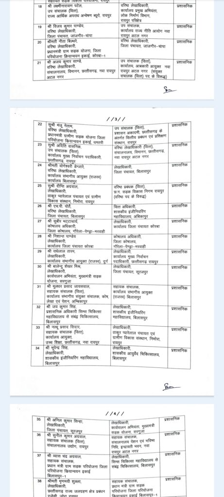 इनमें से कई तो रमन सरकार के समय के अधिकारी हैं, जिनका 2018 में सरकार बदलने के बाद भी ट्रांसफर नहीं हुआ। देखिए वित्त विभाग के पांच पन्नों का ट्रांसफर लिस्ट…..