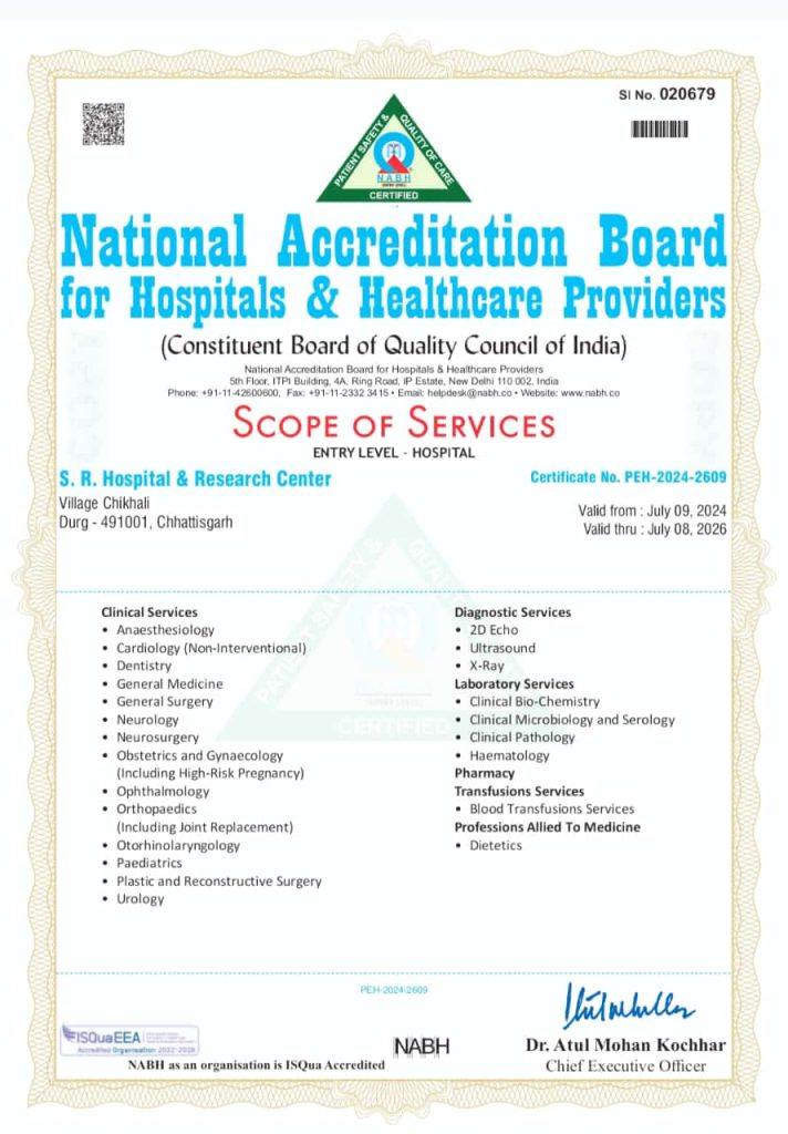 दुर्ग :- जिले के प्रतिष्ठित एस आर हॉस्पिटल एण्ड रिसर्च सेन्टर चिखली को NABH द्वारा मान्यता प्रदान की गई हैं । यह अस्पताल दुर्ग जिले का सबसे बड़ा 180 बिस्तरों का सुपर स्पेशलिटी एवं सर्वसुविधा युक्त अस्पताल है। अस्पताल में आयुष्मान भारत योजना एवं ESIC योजना व भारतीय रेल्वे एवं केन्द्र एवं राज्य सरकार के कर्मचारीओं व विभिन्न हेल्थ इन्श्योरेन्स कम्पनी के हितग्राही मरीजों का कैशलेस ईलाज किया जाता है । अस्पताल मे ICU एवं NICU व अन्य सभी सुविधाएँ उपलब्ध है। NABH द्वारा एनेस्थीसिया कार्डीओलाजी जनरल मेडीसीन जनरल सर्जरी आर्थो पिडियाट्रीक