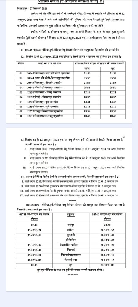 डोंगरगढ़ और रायपुर तक कुछ गाड़ियों का अस्थायी विस्तार किया जाएगा, जबकि कुछ दूरगामी एक्सप्रेस ट्रेनों का 03 से 12 अक्टूबर, 2024 के बीच डोंगरगढ़ स्टेशन पर अस्थायी ठहराव होगा। इससे दर्शनार्थियों को आने-जाने में काफी सुविधा होगी।