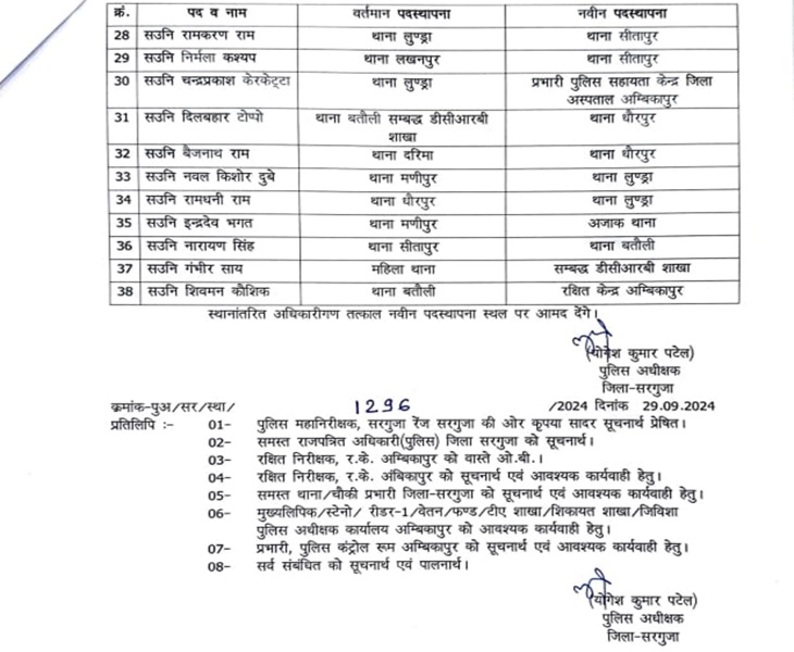 सरगुजा एसपी योगेश पटेल ने रविवार देर शाम कनिष्ट पुलिस अधिकारियों का थोक में तबादला किया है। एक टीआई, 8 एसआई और 30 एएसआई को बदला गया है। इसमें सरगुजा जिले के सभी थाने और पुलिस चौकियों में पदस्थ कनिष्ठ अधिकारी शामिल हैं।