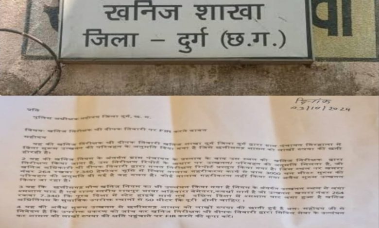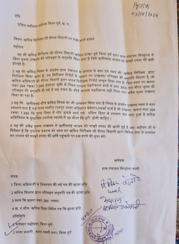 अवैध मुरूम उत्खनन से छत्तीसगढ़ शासन को लाखों रुपया की छाति हुई है जिसके खिलाफ जिला दुर्ग कलेक्टर से निवेदन है कि उपरोक्त प्रकरण को जांच कर खनिज निरीक्षक दीपक मिश्रा द्वारा सिविल सेवा के उल्लंघन कर शासन को लाखों रुपया की क्षति पहुंचाने पर FIR करने की कृपा करे वही पुलिस अधीक्षक एवं थाना नंदिनी को भी सूचनाअर्थ किया गया है।