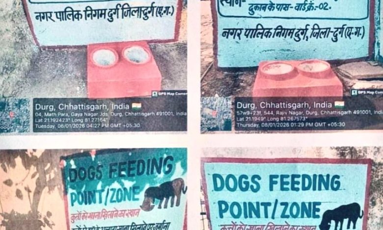 सुप्रीम कोर्ट के आदेश पर नगर निगम दुर्ग ने बनाए डॉग फीडिंग ज़ोन, 🔹अब तय स्थान पर ही खिलाएं आवारा कुत्तों को भोजन, 🔹उल्लंघन पर जुर्माना 60 वार्डों में डॉग फीडिंग ज़ोन, सार्वजनिक सुरक्षा को लेकर निगम की नई पहल, 🔹अन्यत्र डॉग फीडिंग प्रतिबंधित, नियम तोड़ने पर होगी कार्रवाई,