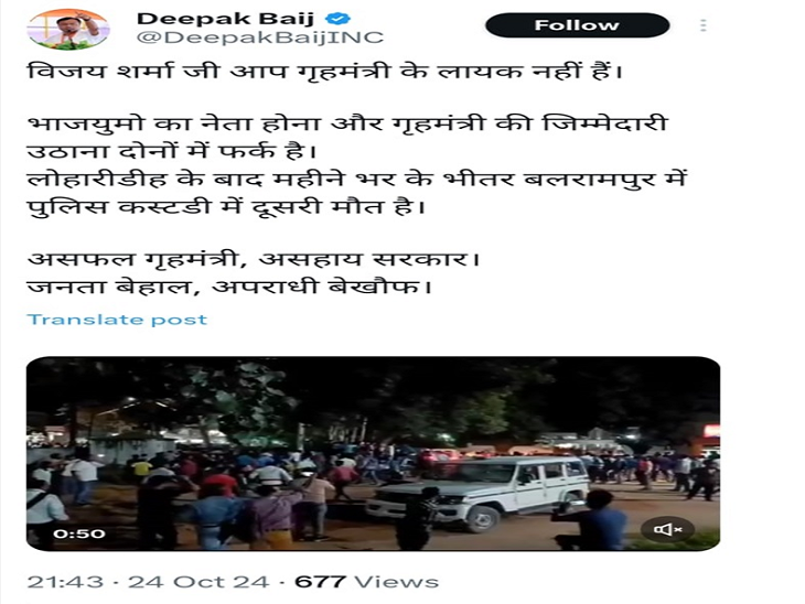 घटना पर पूर्व सीएम भूपेश बघेल और प्रदेश कांग्रेस अध्यक्ष दीपक बैज ने x पर पोस्ट कर गृहमंत्री को हटाने की मांग की है। वहीं मृतक गुरुचरण मंडल के पिता शांति राम ने थाने से बाहर निकलकर कहा कि पुलिस ने मारकर लटकाया, TI और SP तीन दिनों से गुरुचरण को पीट रहे थे, इसलिए उसने फांसी लगा ली। ASP शैलेंद्र पांडेय ने इन आरोपों को खारिज किया है।