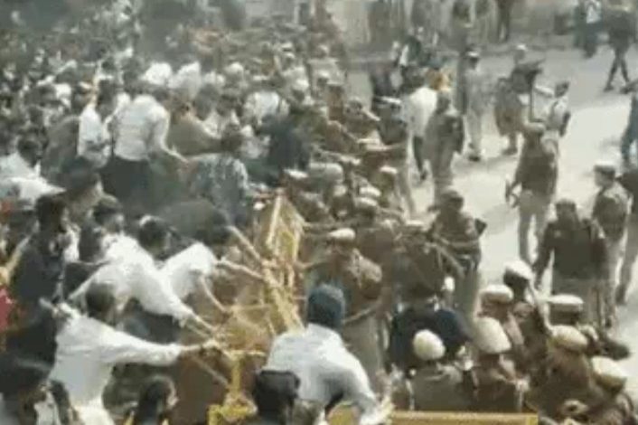 प्रयागराज में हंगामा, प्रदर्शनकारी छात्रों ने बैरिकेडिंग तोड़ी:पुलिस से झड़प, आयोग के गेट तक पहुंचे; जबरन हटाने की कोशिश के बाद भड़के जानिए क्या है पूरा मामला