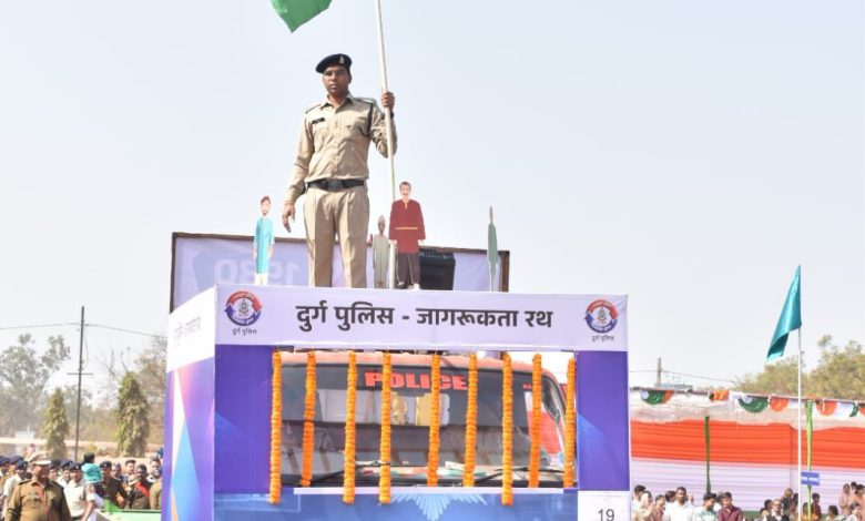 26 जनवरी गणतंत्र दिवस के अवसर पर दुर्ग पुलिस द्वारा झांकी का प्रदर्शन किया गया, जिसका उद्देश्य नागरिकों को यातायात नियमों और साइबर सुरक्षा के प्रति जागरूक करना था।*