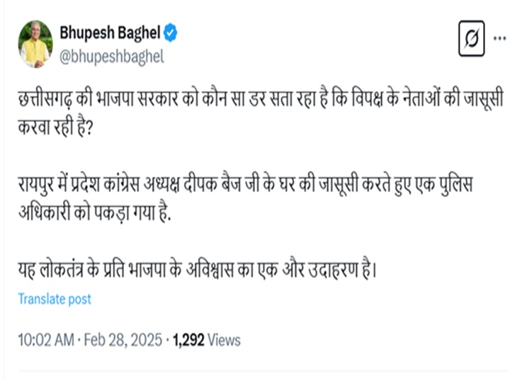 इससे पहले भूपेश बघेल ने सोशल मीडिया प्लेट फॉर्म X पर पोस्ट कर लिखा है कि छत्तीसगढ़ की भाजपा सरकार को कौन सा डर सता रहा है कि विपक्ष के नेताओं की जासूसी करवा रही है?