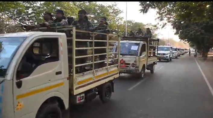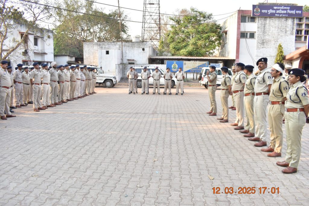जितेन्द्र शुक्ला, पुलिस अधीक्षक, जिला दुर्ग व्दारा दिनांक 13.03.2025 को होलिका दहन एवं दिनांक 14.03.2025 को होली त्यौहार के दौरान शांति एवं सुरक्षा व्यवस्था बनाएं रखने ताकि आम नागरिक सौहार्दपूर्ण वातावरण में होली का त्यौहार मना सके, इसे दृष्टिगत रखते हुये पुलिस कण्ट्रोल रूम, सेक्टर-06 भिलाई से फ्लैग मार्च रवाना किया गया। फ्लैग मार्च रवाना करने के पूर्व उपस्थित पुलिस अधिकारियों एवं कर्मचारियों को पुलिस अधीक्षक व्दारा ब्रीफिंग किया गया कि शहर में पुलिस की चाक चौबंद व्यवस्था रखी जाए। गुण्डा बदमाशों, असामाजिक तत्वों, अशांति फैलाने वालों पर ठोस कार्यवाही की जाए। दुर्ग पुलिस आम नागरिकों से अपील करती है कि वे सद्भावनापूर्वक होली का त्यौहार मनाऐं, साथ ही यदि किसी नागरिक को कोई व्यक्ति किसी भी प्रकार का हथियार चाकू, कदर, कटार, आर्म्स आदि रखने की जानकारी प्राप्त होती है तो उसकी जानकारी अपने नजदीकी थाना/चौकी या पुलिस कण्ट्रोल रूम में दें, उनका नाम एवं मोबाईल नम्बर गुप्त रखा जाएगा। फ्लैग मार्च श्री सुखनंदन राठौर, अतिरिक्त पुलिस अधीक्षक, शहर, दुर्ग के मार्गदर्शन में निकाला गया, जिसमें श्री चिराग जैन, भापुसे, नगर पुलिस अधीक्षक, दुर्ग, श्री राहुल बंसल, परि. भापुसे, नगर पुलिस अधीक्षक, भिलाई नगर श्री सत्य प्रकाश तिवारी, नगर पुलिस अधीक्षक, छावनी श्री हरीश पाटिल, उप पुलिस अधीक्षक, लाईन श्री चन्द्रप्रकाश तिवारी, श्री नीलकण्ठ वर्मा, रक्षित निरीक्षक, दुर्ग एवं दुर्ग-भिलाई शहर के समस्त थाना / चौकी प्रभारी एवं भारी भरकम पुलिस के जवान उपस्थित थे ।
