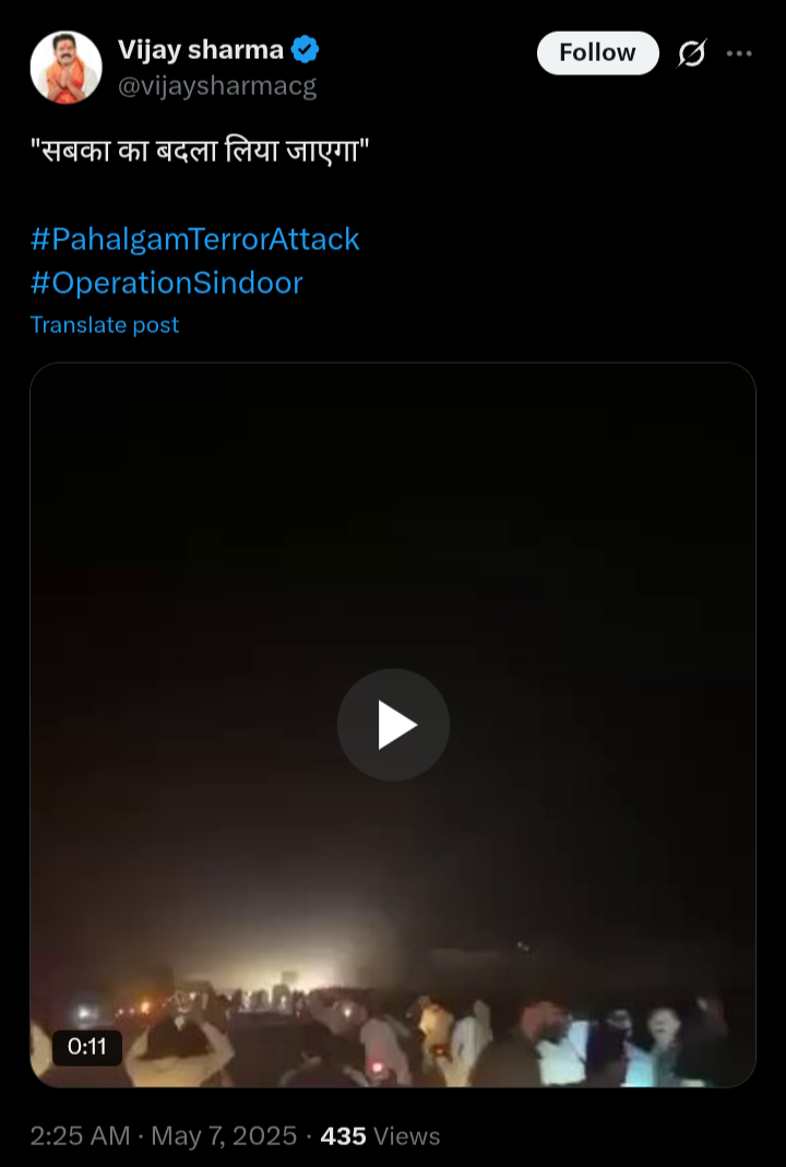 वहीं अंबिकापुर में कांग्रेसियों ने घड़ी चौक पर जमकर आतिशबाजी कर कहा कि आतंकियों को जवानों ने मुंहतोड़ जवाब दे दिया है। मंत्री ओपी चौधरी ने भी घर के बाहर पटाखे फोड़े। इससे पहले मुख्यमंत्री साय ने हर हर महादेव लिखकर सोशल मीडिया पर पोस्ट किया किया। वहीं उपमुख्यमंत्री विजय शर्मा ने भी लिखा कि, सबका बदला लिया जाएगा।