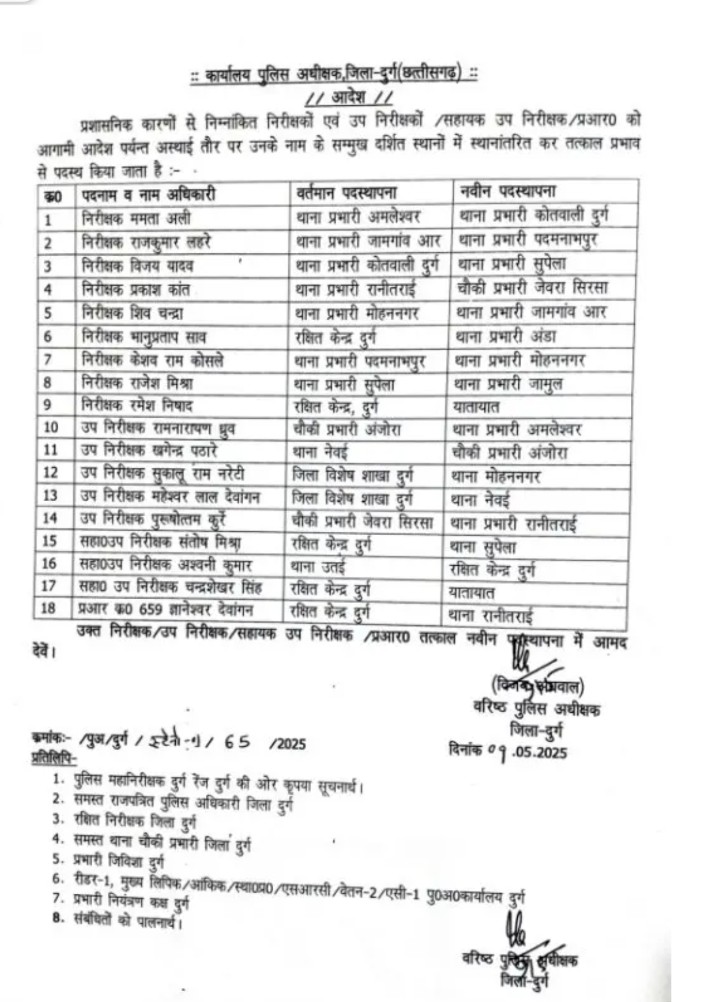 दुर्ग पुलिस में पदस्थ 04 सहायक उप निरीक्षकों को उप निरीक्षक पद पर पदोन्नति उपरांत स्टार लगाकर SSP ने दी बधाई