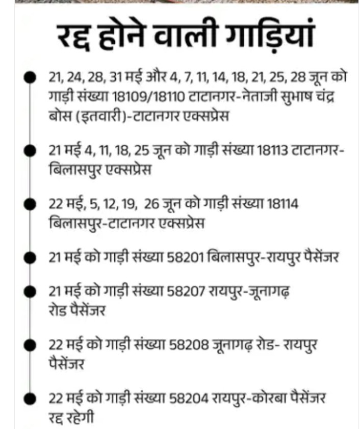 छत्तीसगढ़ से गुजरने वाली 9 ट्रेनें रद्द:झारखंड-ओडिशा जाने वाले यात्री परेशान होंगे, 28 जून तक नहीं चलेंगी गाड़ियां, कई ट्रेनों का रूट बदला