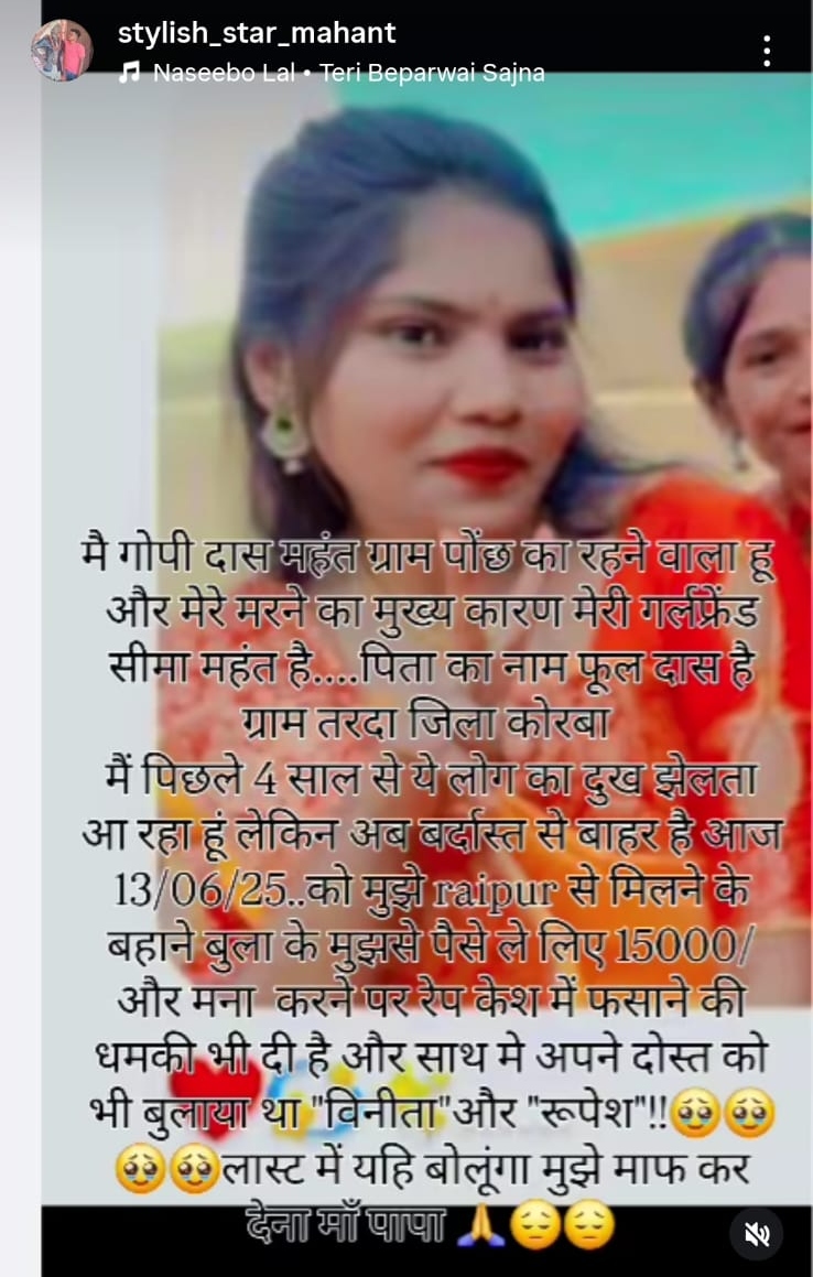 आज 13-06-25 को मुझे मिलने के बहाने रायपुर बुलाकर 15000 पैसे ले लिए और मना करने पर रेप केस में फंसाने की धमकी दी और साथ में अपने दोस्तों को बुलाया था, विनिता और रूपेश….लास्ट में यही बोलूंगा मुझे माफ कर देना मां पापा….