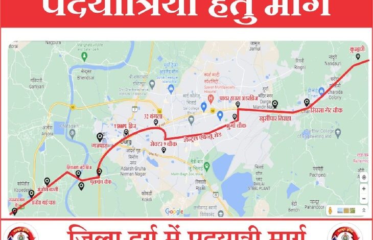 🔸 *पदयात्रियो के लिए बनाये गये रूट चार्टः-* कुम्हारी टोल प्लाजा-सिरसा गेट चौक-डबरापारा तिराहा-खुर्सीपार तिराहा-पावर हाउस अण्डर ब्रिज-मुर्गा चौक-सेन्ट्रल एवेन्यु होते हुए सेक्टर-09 चौक- MD बांग्ला तिराहा – ठगडा बांध ओवर ब्रिज के नीचे-जेल तिराहा-गांधी तिराहा-पटेल चौक-गंजपारा-पुलगांव चौक-शिवनाथ नदी ब्रिज-अंजोरा बाईपास-राजनांदगांव से होकर डोगरगढ़ जायेगें।