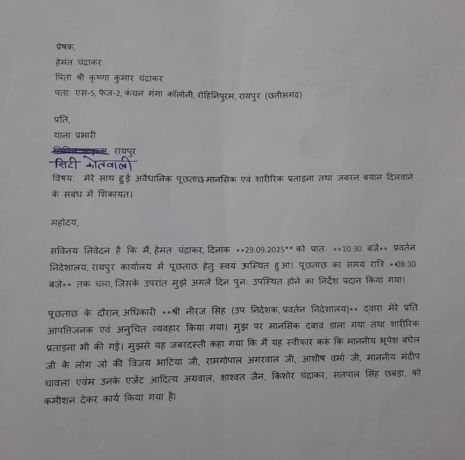 शिकायत के मुताबिक, हेमंत पर पूर्व मुख्यमंत्री भूपेश बघेल और उनके सहयोगियों पर कमीशन लेने की बात स्वीकार लेने का दबाव बनाया गया। ऐसा नहीं करने पर अधिकारियों ने उनसे मारपीट की।