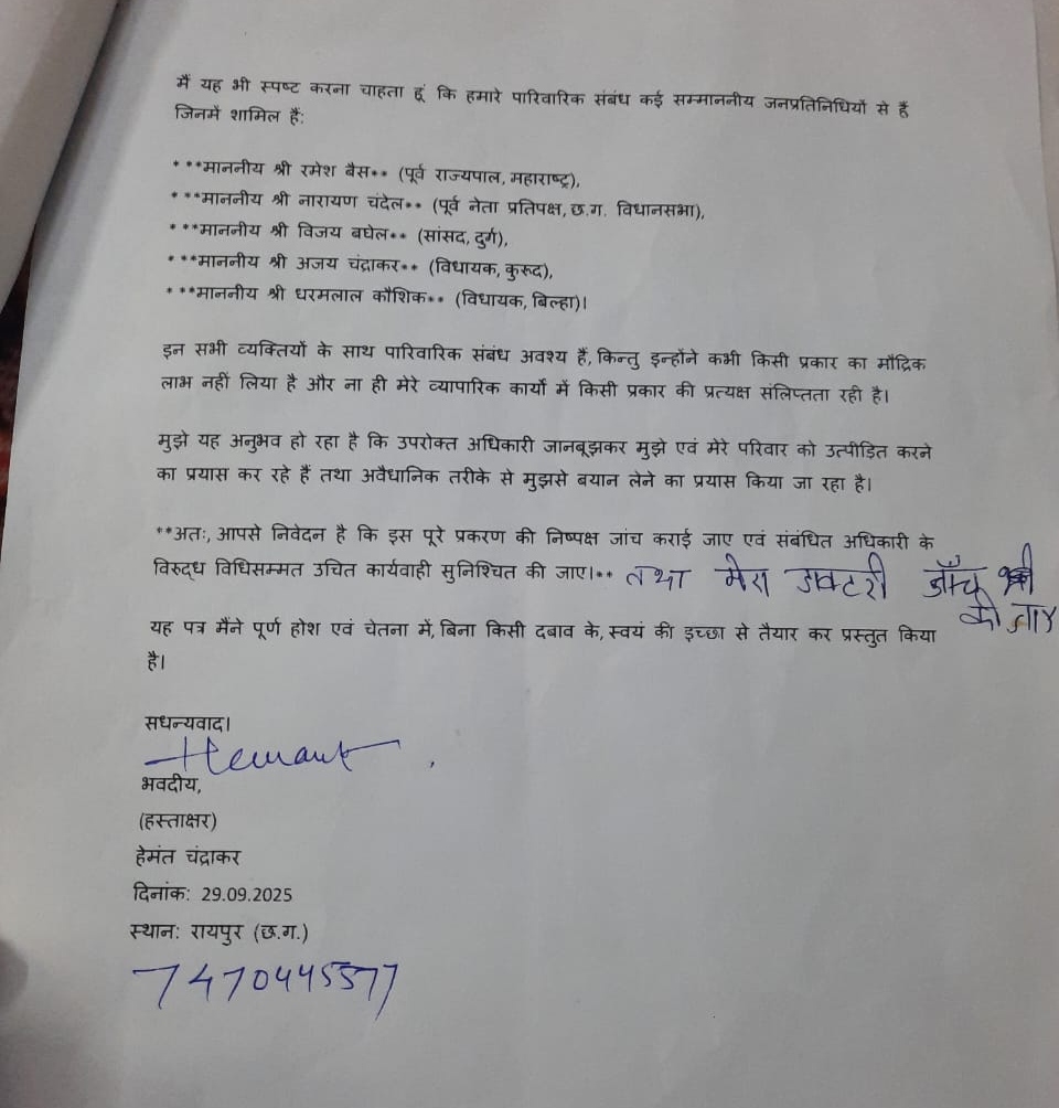 हेमंत ने अपने शिकायत में लिखा है कि कुछ सीनियर BJP नेता भी उनके रिश्तेदार है, उनसे पारिवारिक संबंध है लेकिन उन्होंने किसी तरह का मौद्रिक लाभ नही लिया है। हेमंत चंद्राकर ने देर रात कोतवाली थाना पहुंचकर शिकायत दर्ज करवाई और कार्रवाई की मांग की है।