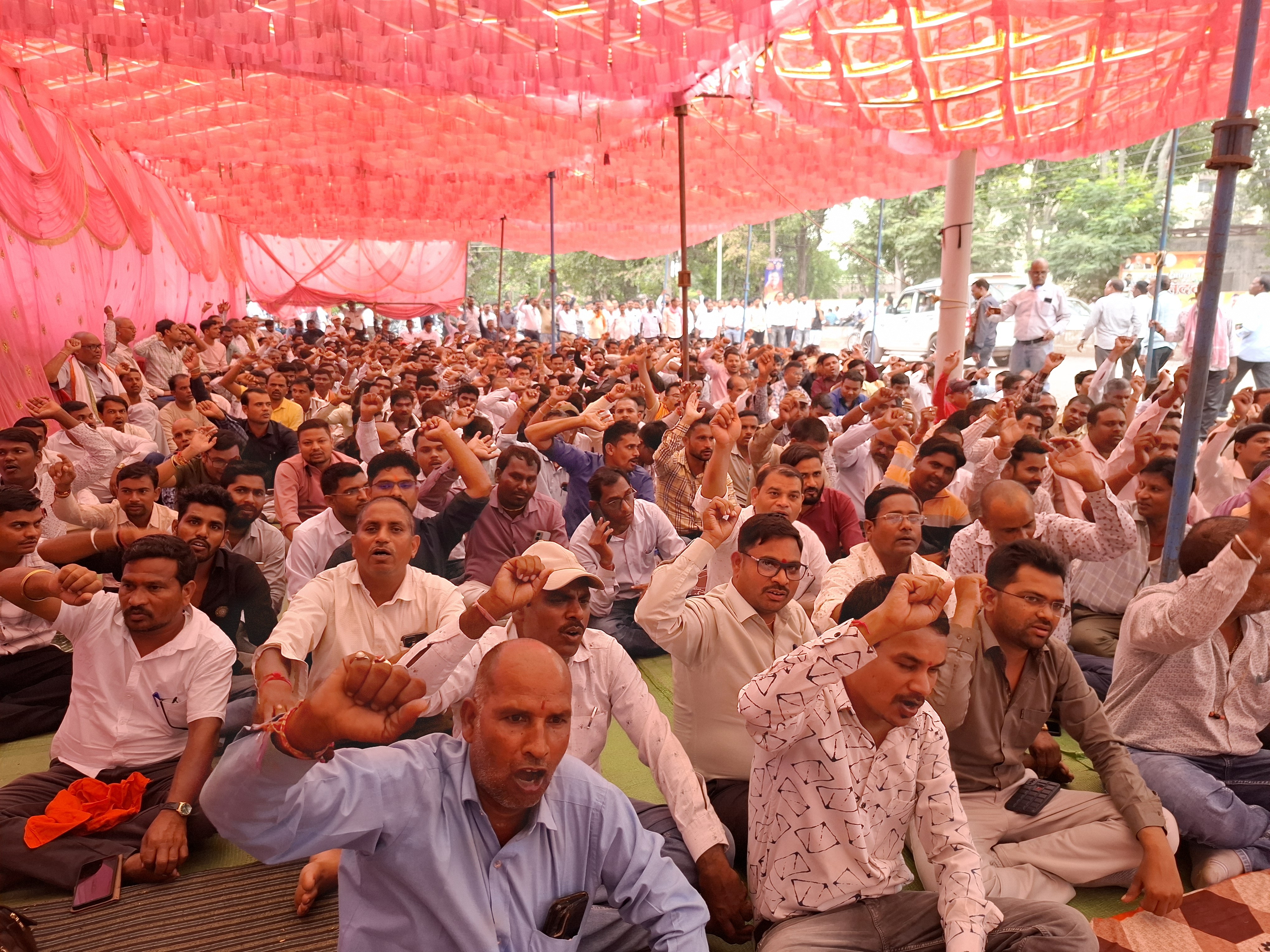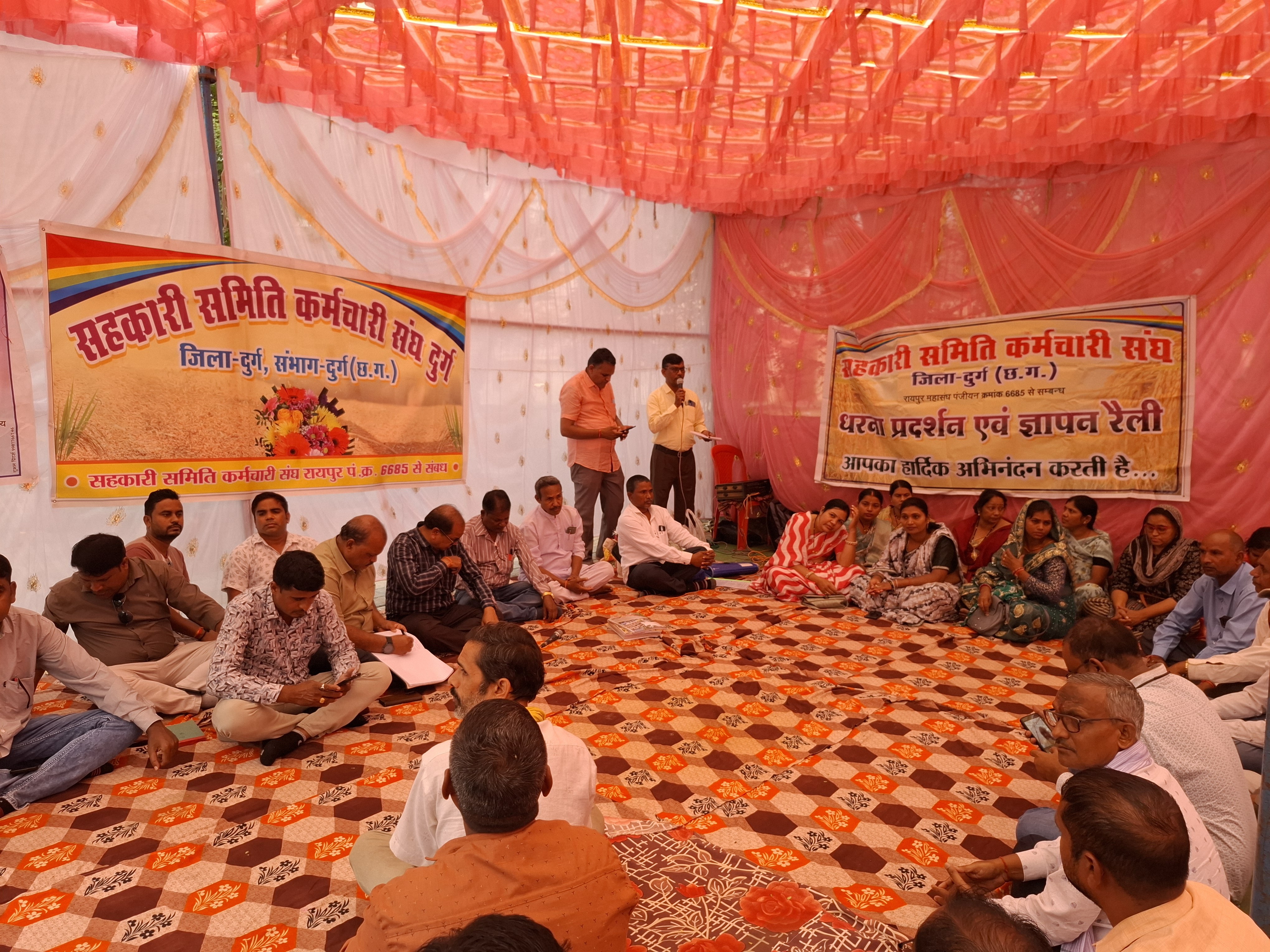 दुर्ग के मानस भवन के पास प्रदर्शन सहकारी समिति कर्मचारी करेंगे धान खरीदी का बहिष्कार:चार सूत्रीय मांगें लंबित, सरकार को अनिश्चितकालीन आंदोलन की चेतावनी