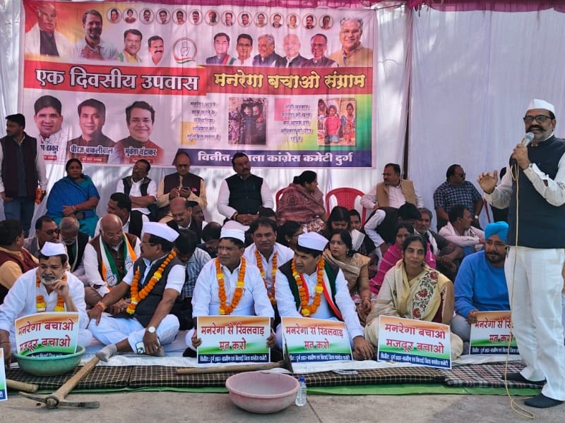 दुर्ग-भिलाई में छत्तीसगढ़ कांग्रेस ने रविवार से मनरेगा बचाओ संग्राम अभियान के तहत सार्वजनिक विरोध शुरू कर दिया है। शहर और ग्रामीण जिला कांग्रेस कमेटी के कार्यकर्ता सुबह से शाम तक दुर्ग के गांधी प्रतिमा स्थल पर उपवास पर बैठे हैं। कांग्रेस नेताओं ने आरोप लगाया कि भाजपा सरकार सुनियोजित तरीके से मनरेगा को कमजोर कर रही है और इसे धीरे-धीरे खत्म करने की साजिश रची जा रही है। बीजेपी अमीरों की पार्टी है, मजदूरों के हक को खत्म किया जा रहा है।