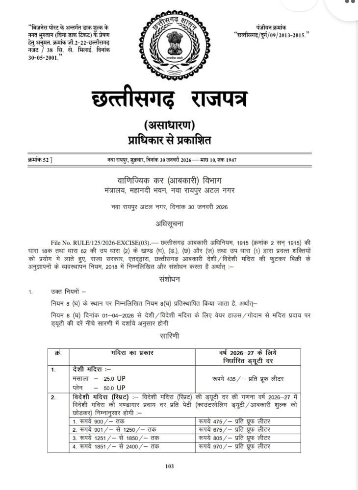 छत्तीसगढ़ में शराब की कीमतें बढ़ने वाली है। राज्य सरकार ने शराब पर संशोधित आबकारी ड्यूटी की अधिसूचना जारी कर दी है। जिसे 30 जनवरी 2026 को राजपत्र में पब्लिश किया गया। नई दरें 1 अप्रैल 2026 से लागू होंगी। इसके तहत देसी-विदेशी और बीयर महंगी होगी।