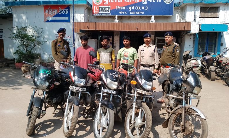 भिलाई में मोटरसाइकिल चोर गिरोह को पुलिस की टीम ने दबोचा ▪️ अलग-अलग थाना क्षेत्रों के कुल 04 मोटरसाइकिल चोरी का खुलासा ▪️ चोरी के वाहनों के पार्ट्स निकालकर बेचने की करते थे तैयारी ▪️ तीन आरोपियों भेजे गए जेल