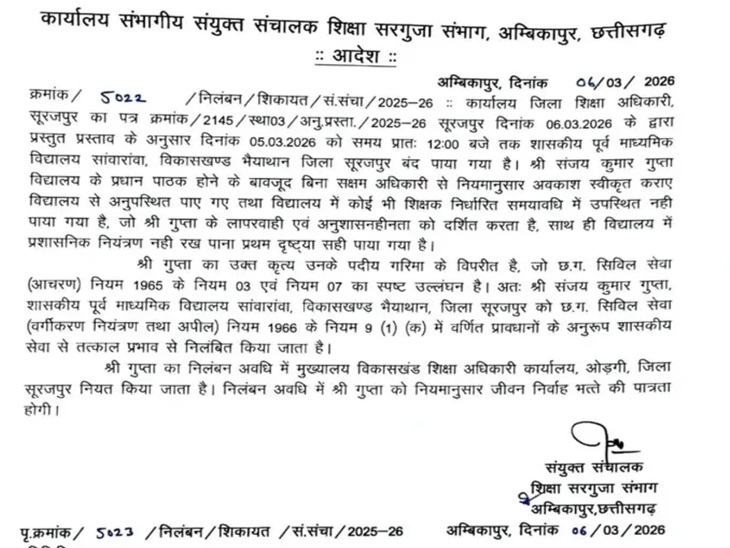 डीईओ के रिपोर्ट पर संयुक्त संचालक शिक्षा संजय गुप्ता ने सावारांवा स्कूल के हेडमास्टर संजय कुमार गुप्ता को सस्पेंड कर दिया है। उनका मुख्यालय ओड़गी बीईओ कार्यालय नियत किया गया है।