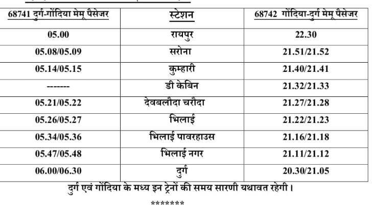 – 68742 / 68741 गोंदिया-दुर्ग-गोंदिया मेमू पैसेजर को रायपुर तक विस्तारित की जा रही है।