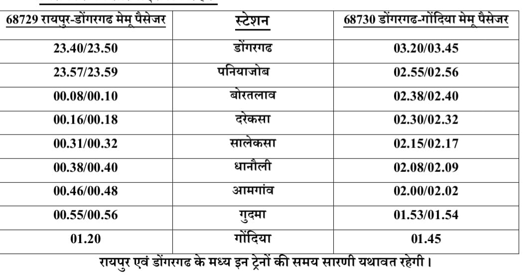 वहीं, चार लोकल ट्रेनों का विस्तार किया गया है। जबकि, डोंगरगढ़-दुर्ग के बीच स्पेशल ट्रेन भी चलाई जाएगी।