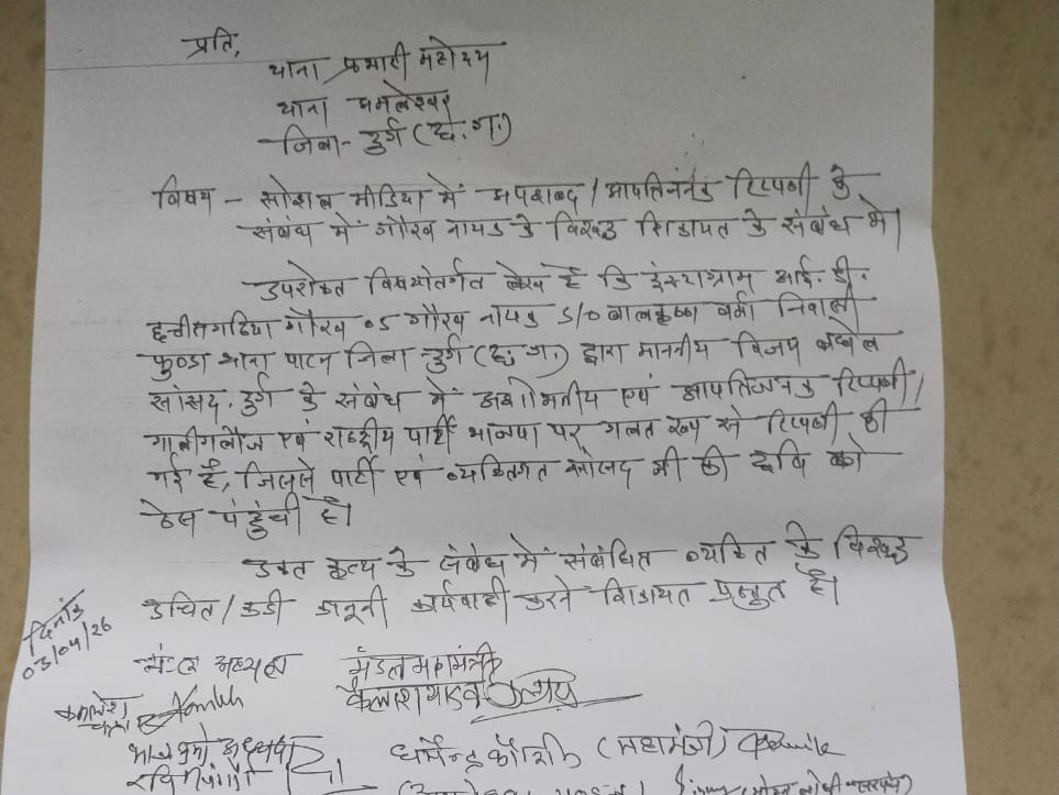 अमलेश्वर थाना पहुंचे भाजपा मंडल अध्यक्ष कमलेश चंद्राकर ने आरोप लगाया कि फुंडा निवासी गौरव नायक, पिता बालकृष्ण वर्मा ने सोशल मीडिया पर अभद्र भाषा का इस्तेमाल किया है। शिकायत में इसे न केवल सांसद का अपमान बताया गया, बल्कि एक राष्ट्रीय पार्टी की छवि को नुकसान पहुंचाने का प्रयास भी कहा गया।