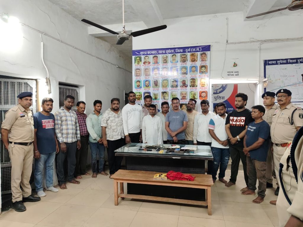 दिनांक 17.04.2026 को थाना सुपेला क्षेत्र अंतर्गत भिलाई नगर रेलवे स्टेशन के सामने कोसनाला के पास सार्वजनिक स्थान पर कुछ व्यक्तियों द्वारा जुआ खेलने की सूचना प्राप्त हुई। सूचना पर तत्काल पुलिस टीम द्वारा घेराबंदी कर मौके पर दबिश दी गई, जहां 15 व्यक्तियों को जुआ खेलते रंगे हाथ पकड़ा गया।